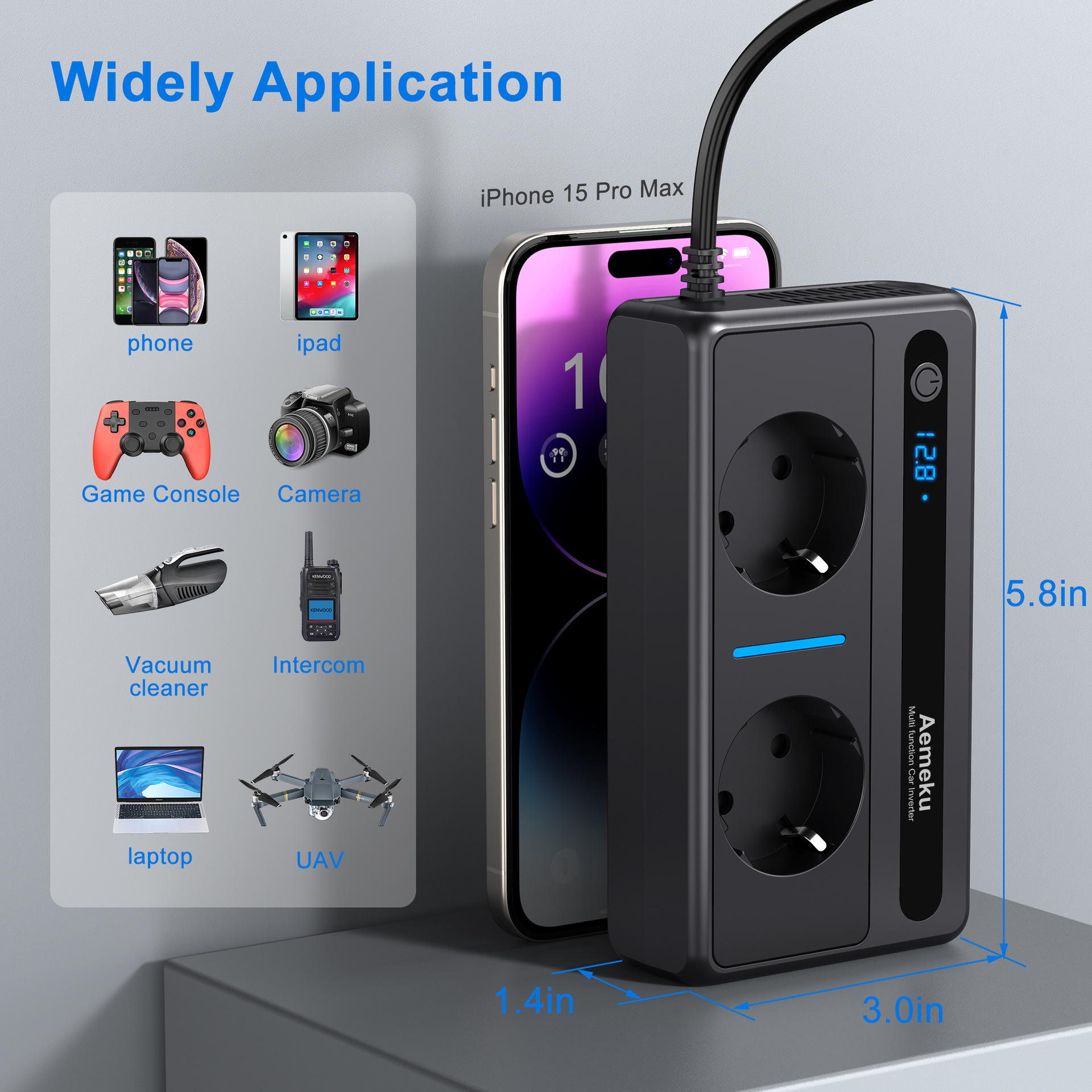 [Quiet Cooling Fan & LED Indicator]The Aemeku AC socket car adapter has a built-in intelligent cooling fan. This fan keeps the car power inverter quiet during operation and runs faster when the inverter gets hot. The LED indicator shows the working status: a blue light means it is in operation.