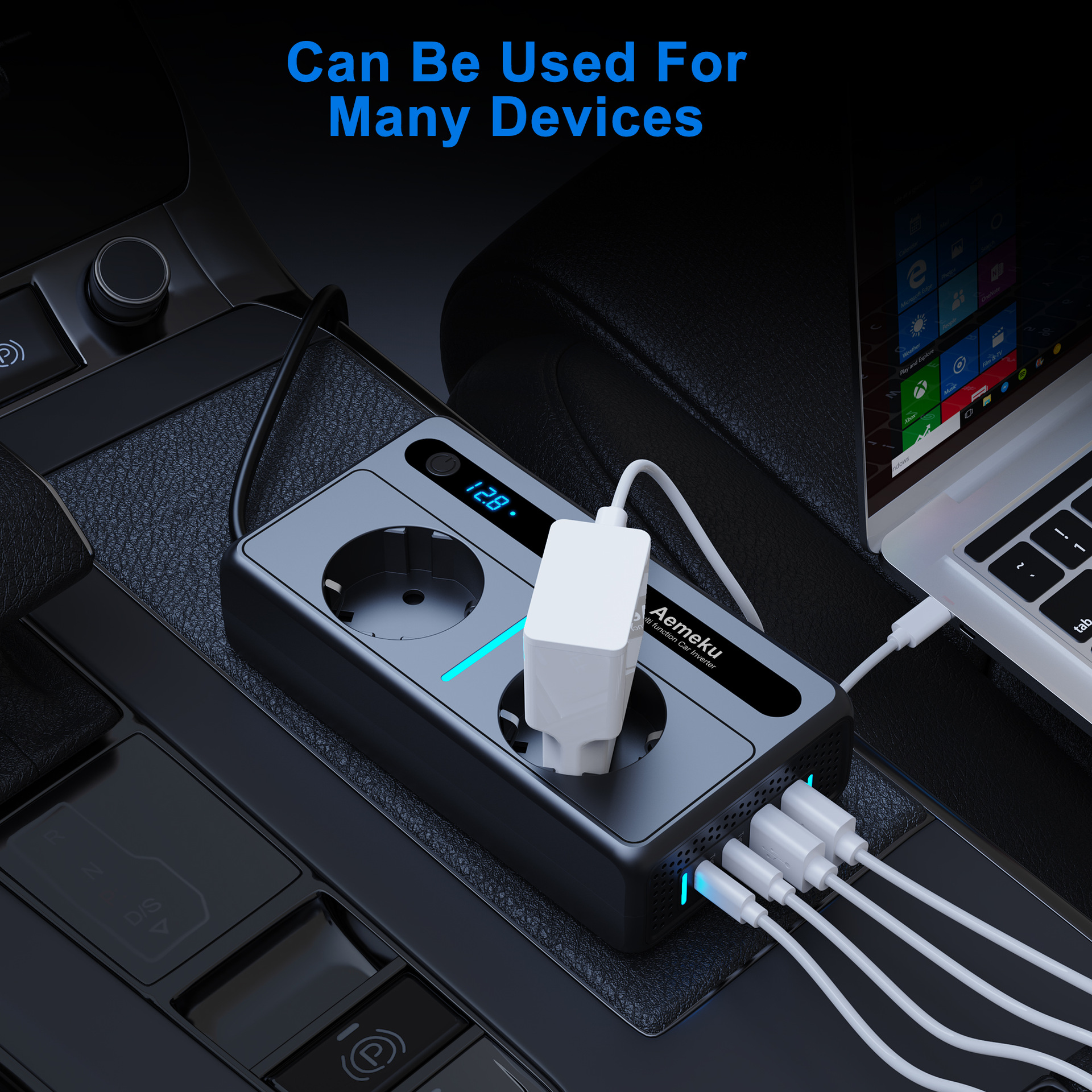 [Fuse & Intelligent Ports for Safe Design]Besides the two AC power sockets and four USB ports, a built-in SMART chip is integrated to identify connected devices. It offers 100% safety protection against overheating, under-voltage and over-voltage charging, short circuits, overloads and over-charging. A built-in 15A fuse protects the car inverter and your devices.